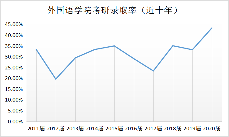 2020届毕业生共有254人(其中:英语、俄语、法语总计194人,英语公费师范生60人),报考187人(其中:英语、俄语、法语总计171人,英语公费师范生16人),除公费师范生外,报考率达88.14%,过国家A线比例达到54.6%,共有95名同学顺利考取了硕士研究生(其中:英语、俄语、法语考取84名、英语公费师范生考取11名),除公费师范生外,考研升学率达43.3%,其中10名同学被国外高校录取。考研成功人数、升学率均创近十多年来新高。