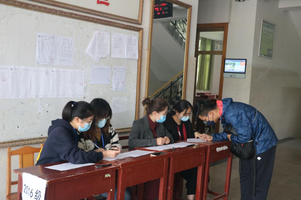 学生代表在学院门口帮助考生们进行体温测量。进门后,两侧分别为15级、16级考生的登记处,成人动漫