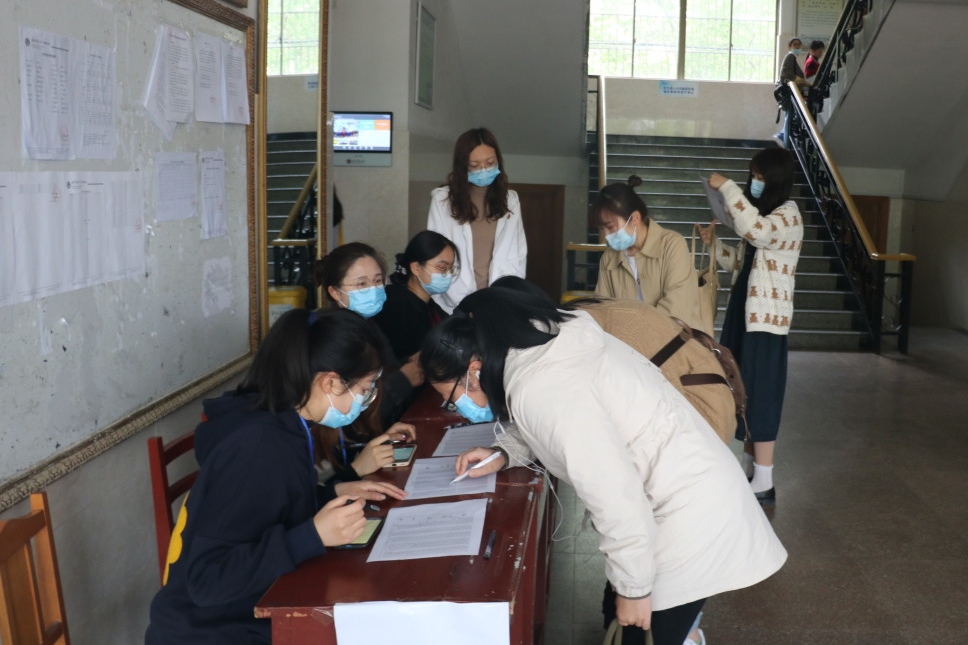 全体辅导员及团委学生会部分学生干部为考生登记信息并维持进场秩序,为未佩戴口罩的同学提供防疫用品,保障考试的顺利进行,并鼓励考生们放平心态,沉着应对。