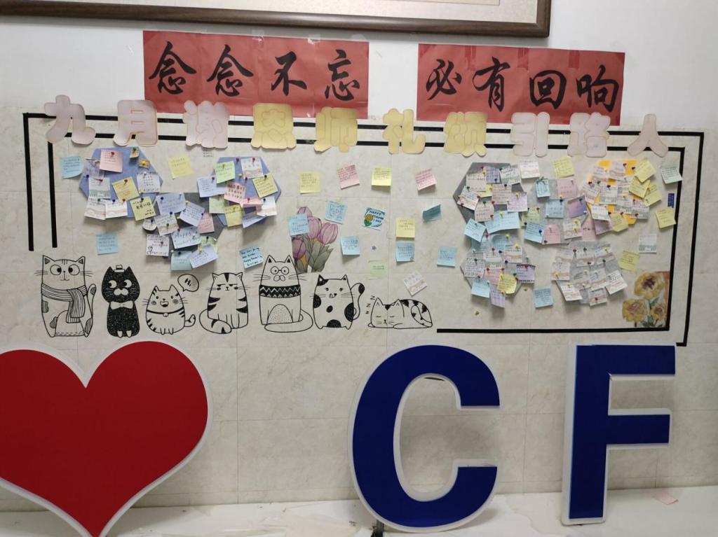 还组织同学们用便利贴抒发自己的感激之情。“三尺讲台,两袖清风,潜心育人,师者仁心”、“桃李天下香满人间,英才济济笑开颜”等一句句肺腑之言被张贴到宣传墙上,既激励同学们要自我勉励,不忘师恩,更表达了同学们对老师发自肺腑的感谢之情。