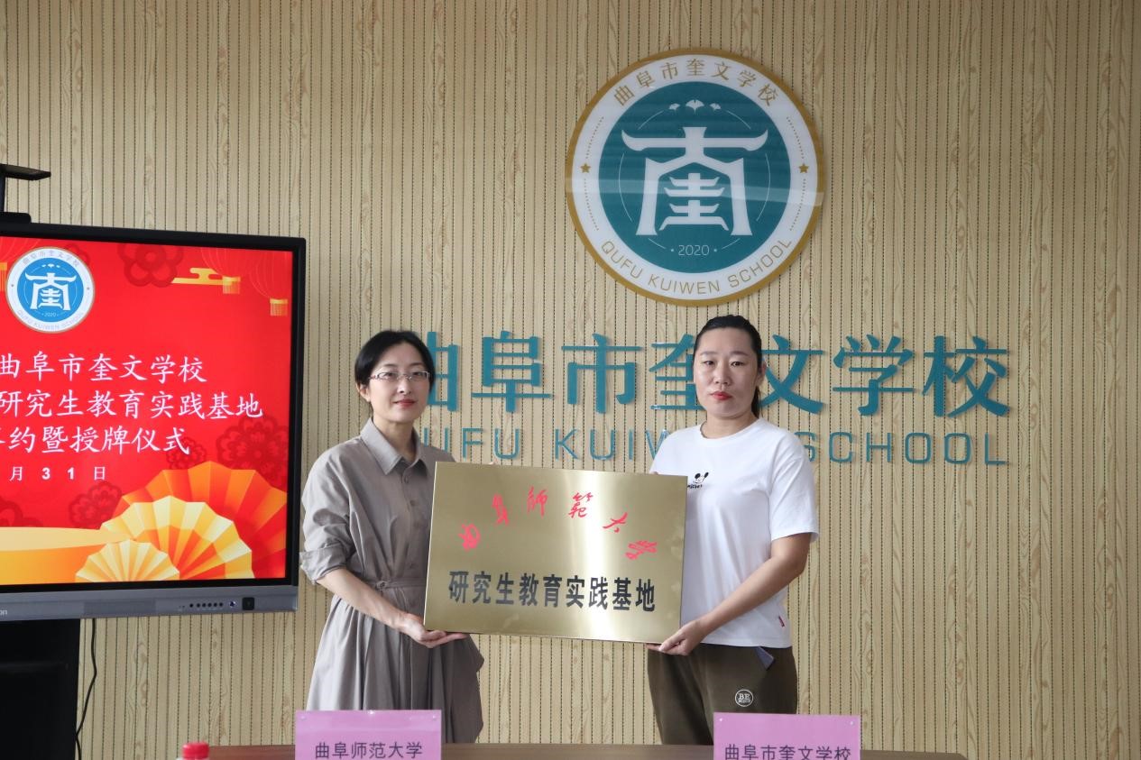 孔蕾教授与曲阜市奎文学校副校长李良签约研究生教育实践基地协议书并分别授牌。