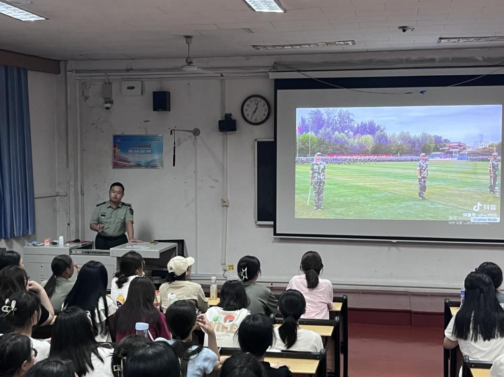 会上,赵文彬老师首先为同学们播放了往年军训时的视频,激发了同学们军训的积极性。然后结合当前国情、国家政策与相关实例为同学们讲解征兵入伍相关知识,鼓励同学们积极报名参军,为国效力。最后,赵文彬老师综合讲解国防安全知识,敦促同学们关注时事,热爱国家,提高国家安全意识。同学们认真听讲,关注学校军训事务与国防安全,积极配合老师互动。