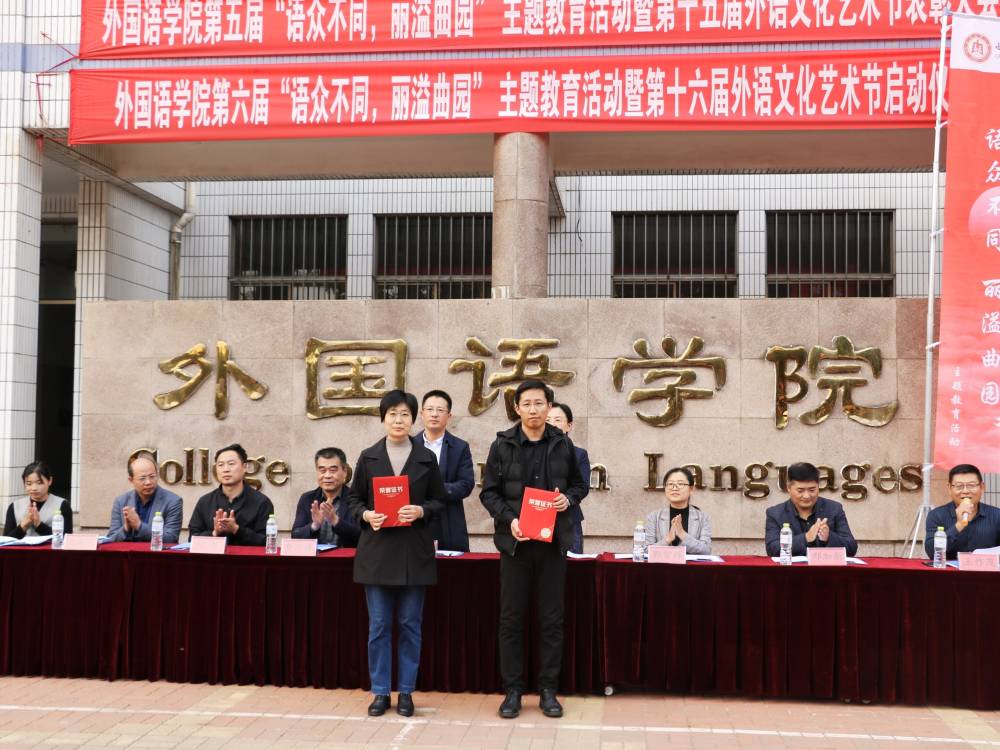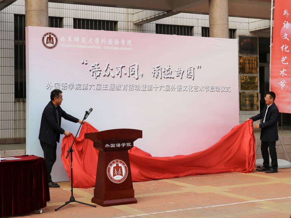 党委书记费沂涛共同为活动揭幕,标志着第六届“语众不同,丽溢曲园”主题教育活动暨第十六届外语文化艺术节正式拉开帷幕。最后,领导老师及同学代表在签名板前郑重签名,留下了对本次活动的美好祝愿和期待。至此,本次启动仪式圆满落幕。