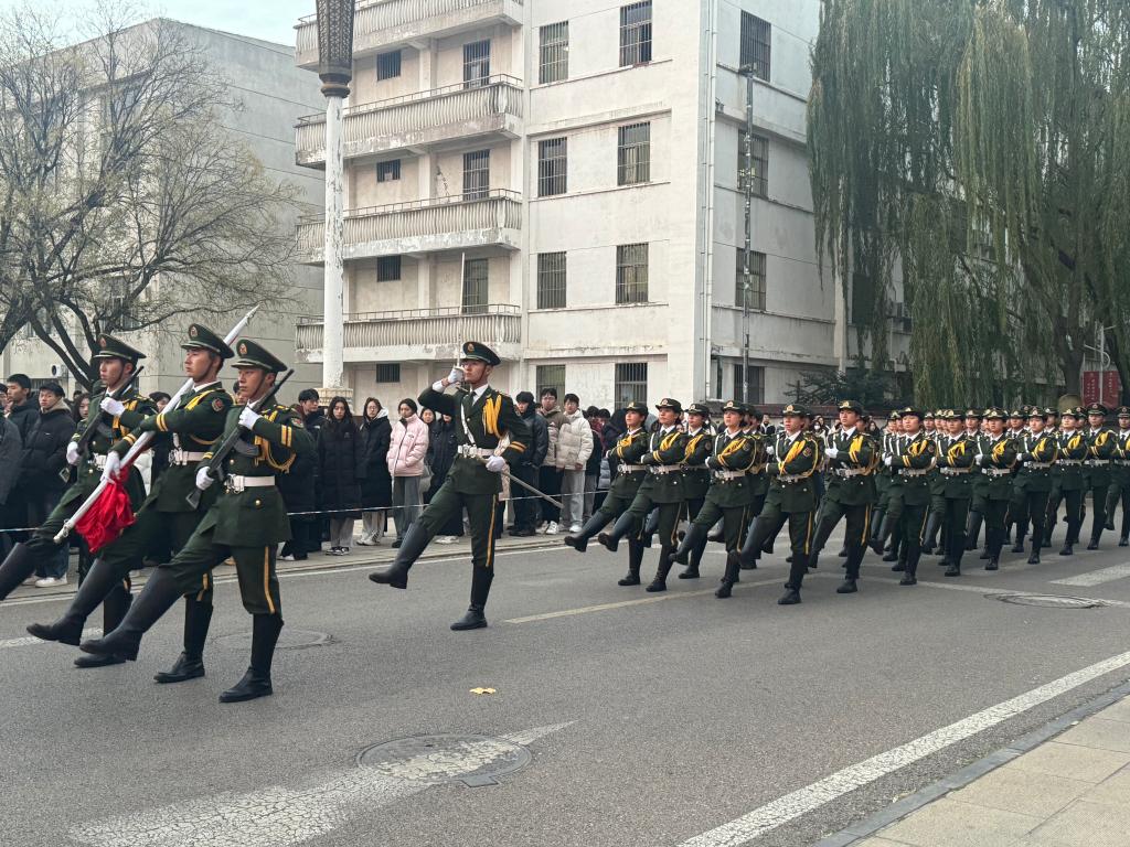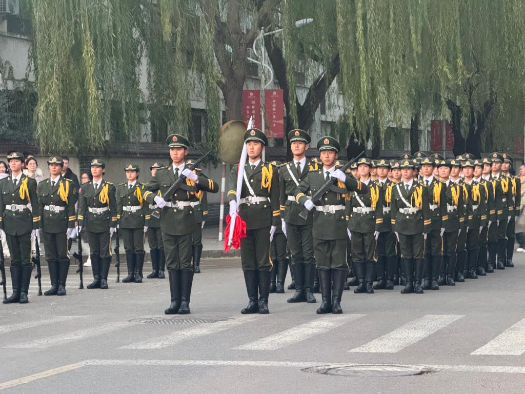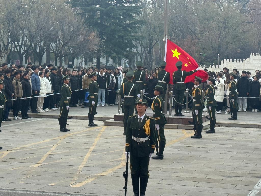 国护队迈着铿锵有力的步伐,护送着鲜艳的五星红旗走向升旗台。随着雄壮的国歌声响起,旗手奋力一挥,五星红旗迎风展开,冉冉升起。队员们身姿挺拔,目光坚定,向国旗行注目礼,深刻表达对伟大祖国的崇高敬意和深厚情感。