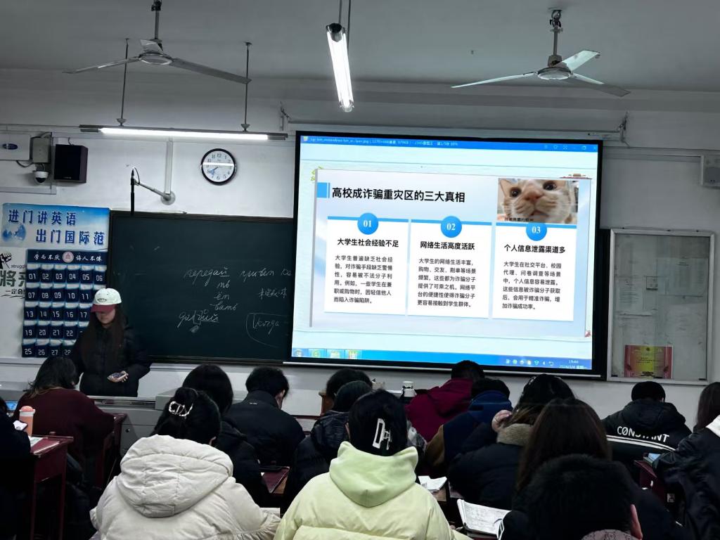 首先,班会以大学生遇到诈骗的原因和校园诈骗的类型为出发点,重点介绍电信网络诈骗的典型方式。随后,各班级从电信诈骗的实例出发,详细介绍各类电信诈骗的常见作案手法,深入剖析各大常见电信诈骗的底层逻辑,并提出兼具实效性与可行性的自我保护手段及规避方法。最后,各班级强调认识分辨电信诈骗的重要性,同时教育同学们应具有分辨电信诈骗的基本能力,掌握关乎个人人身安全和财产安全的反诈知识。