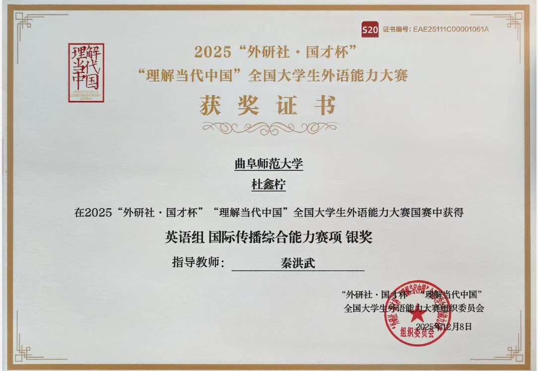 英语专业杜鑫柠(指导教师:秦洪武)获得英语组(综合能力)国赛银奖,孙晓璐(指导教师:徐欣)获得英语组(笔译)国赛铜奖,俄语专业李彦(指导教师:王洪明、关月月、田守欣)获得俄语组国赛铜奖,法语专业于瑞霄(指导教师:赵彤、唐友霞、伊春荣)获得法语组国赛铜奖。