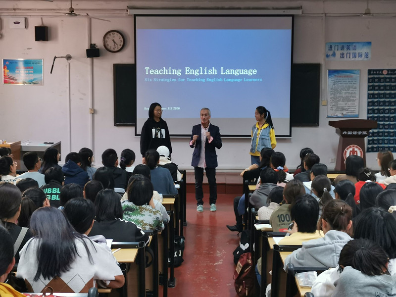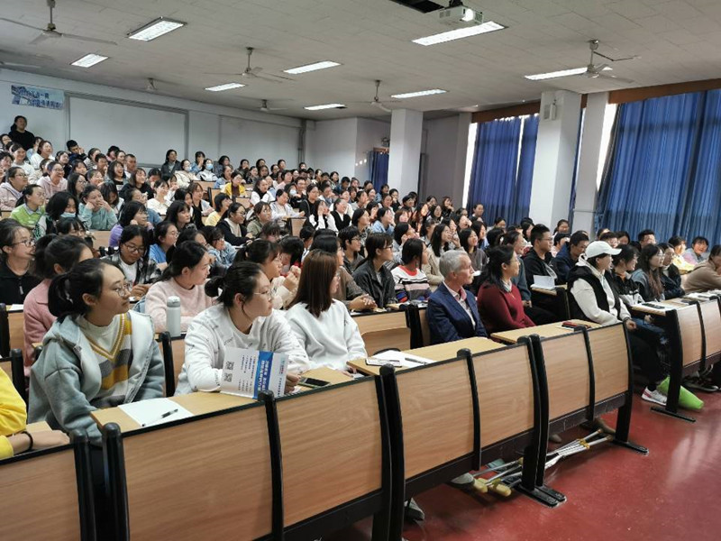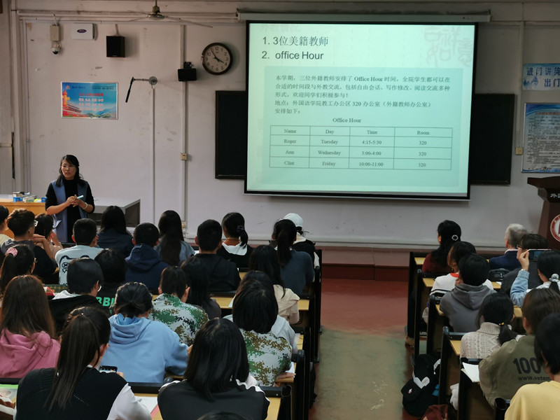 刘萍老师对新生的到来表示热烈欢迎,随后高歌老师对外院历史、专业培养方案、教学计划、学业规划及素质拓展进行了全面的介绍及解读。其中,高歌老师从教学目标、课程体系设置、学制及实践教学四个方面详细分析了专业教学方案,解决了新生在专业学习方面的困惑。希望新同学们努力提高语言素养,培养跨文化交际能力和思辨能力,做热爱教育事业的优秀教育人才。外教Roger形象生动地为同学们阐述了英语的魅力,并提出了英语学习的策略。