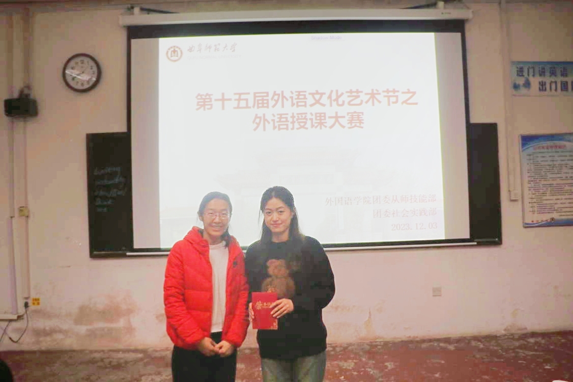 比赛过程中,选手们自信满满,以流利的口语、精彩的PPT和热情自如的互动引领学生学习课程内容,营造出良好的、积极向上的课堂氛围,感染了现场的老师和同学。其中,张晓以“Where is my glasses?”的问题为导入,引发同学们的思考;于文璐自然大方的表现、温柔亲切的言语获得了观众和评委老师的一致好评;李燕妮生动有趣的课堂互动、开朗自信的表达给观众留下了深刻印象。最终,张晓荣获一等奖;李燕妮、张安丽、于文璐荣获二等奖;孙凡舒、王亚菲、蔡雨珊荣获三等奖。