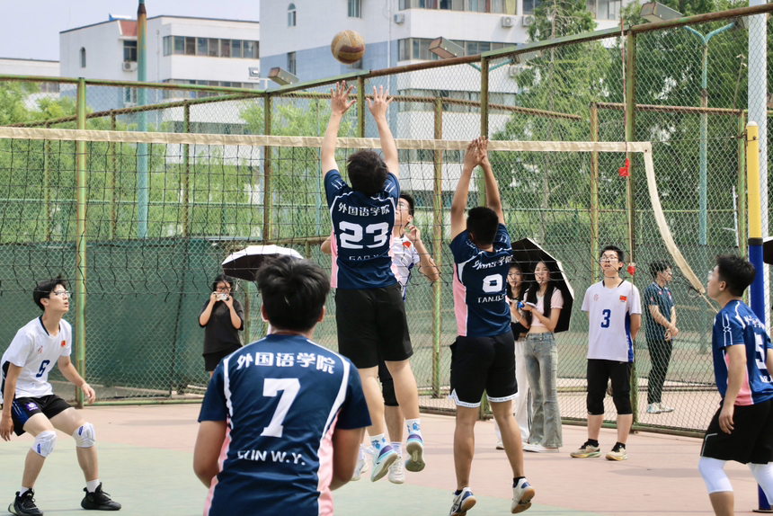 男排对战文学院,在西排球场展开激烈比拼。