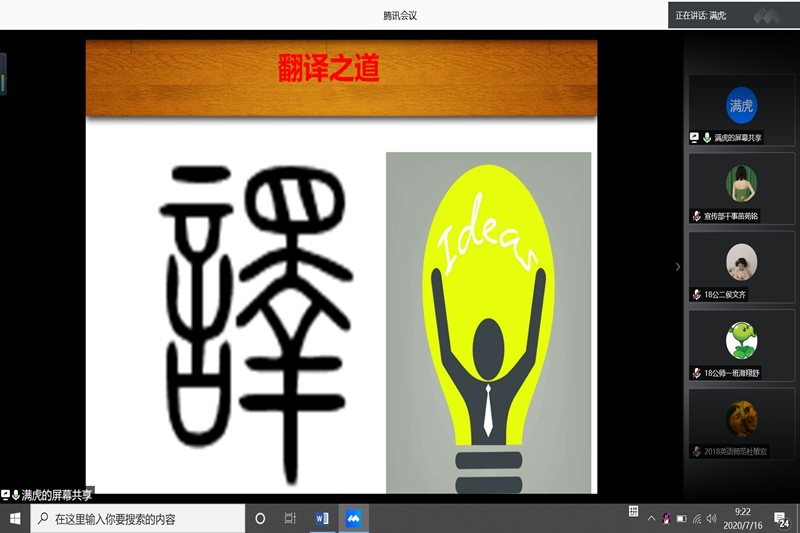 于7月16日上午成功举办“‘译’己之见:翻译漫谈与学习之道”讲座。本次讲座由满虎老师主讲,2018级英语专业学生参加。