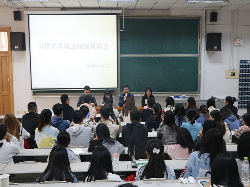 会议伊始,王作茂老师就新学期的工作调度做出解释,并为同学们介绍新到任的辅导员老师。首先,王旖旎老师表达了重回外院的喜悦之情,并表示愿意继续为同学们解疑答惑、排忧解难。而后,王静娴老师为其主要负责的公师班提出建议;她指出,公师班的同学虽然没有考研压力,但依旧要努力学习,考取相关证书,为自己未来工作增添筹码。最后,赵文彬老师强调了相关纪律问题,明晰请假流程,要求同学们按规定进行申请。他强调,疫情期间,健康打卡是重中之重。这就要求同学们提高意识,自觉打卡。如果同学们产生发烧情况,要及时上报学院,并与辅导员取得联系。关于学习方面,他提醒同学们要好好准备专四考试及下学期的实习内容;了解好自己的考研意向,确定目标,并做出相应努力。最后,老师们对迎新工作中辛勤努力的学生会干部表示感谢,祝愿全体2018级外院学子前程似锦、未来光明。