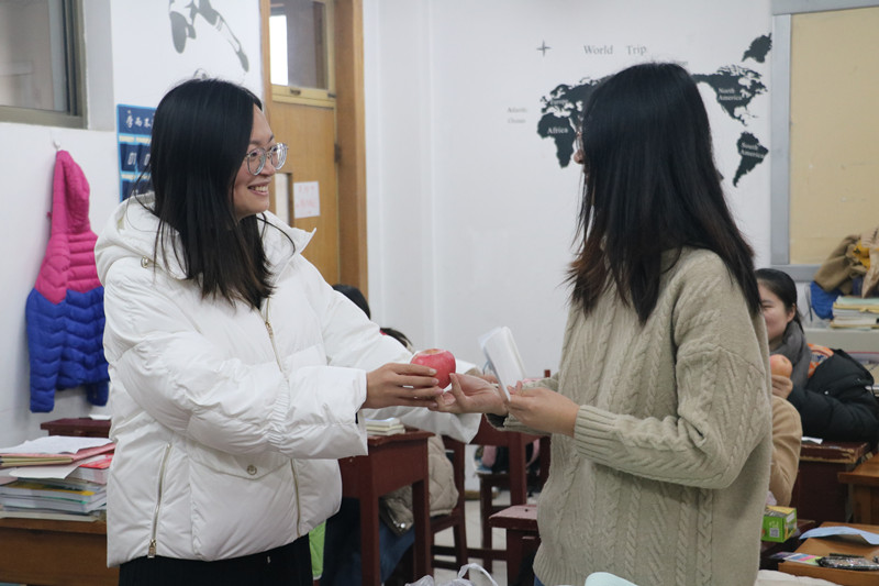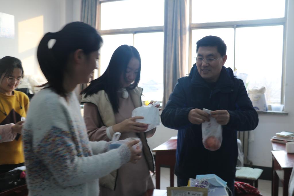 老师们分别将学院精心制作的“考研爱心礼包”分发给同学们,并为他们加油打气。“考研爱心礼包”中有糖果、水果以及与水果寓意相关的贺卡:柿子象征着“柿柿”顺心、万“柿”如意,橙子寓意着学业有“橙”、心想事“橙”,橘子寓意着一“橘”夺魁……这一份份充满温暖的礼物,令正处在紧张备考状态的考研学子们感受到来自学院的温暖与爱。同学们收到爱心礼包后,脸上都洋溢着幸福的笑容。
