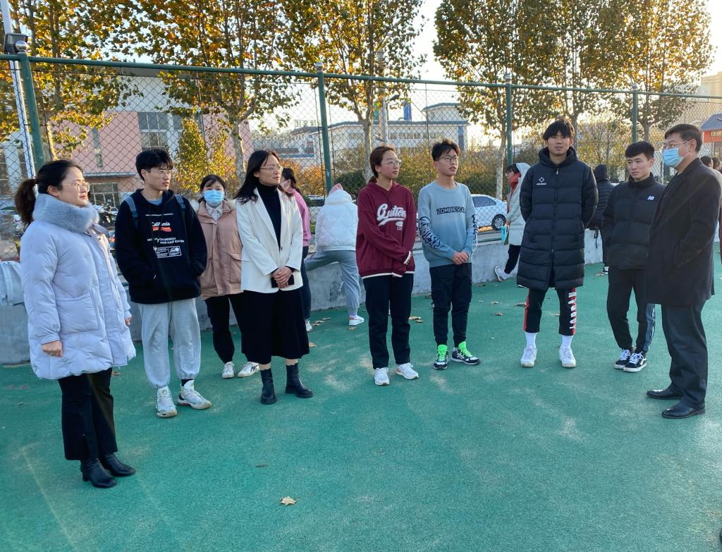 118下午外国语学院党委副书记王作茂及辅导员老师张晓、赵文彬、王伟、王仁杰前往学校西操场,慰问冬训同学
