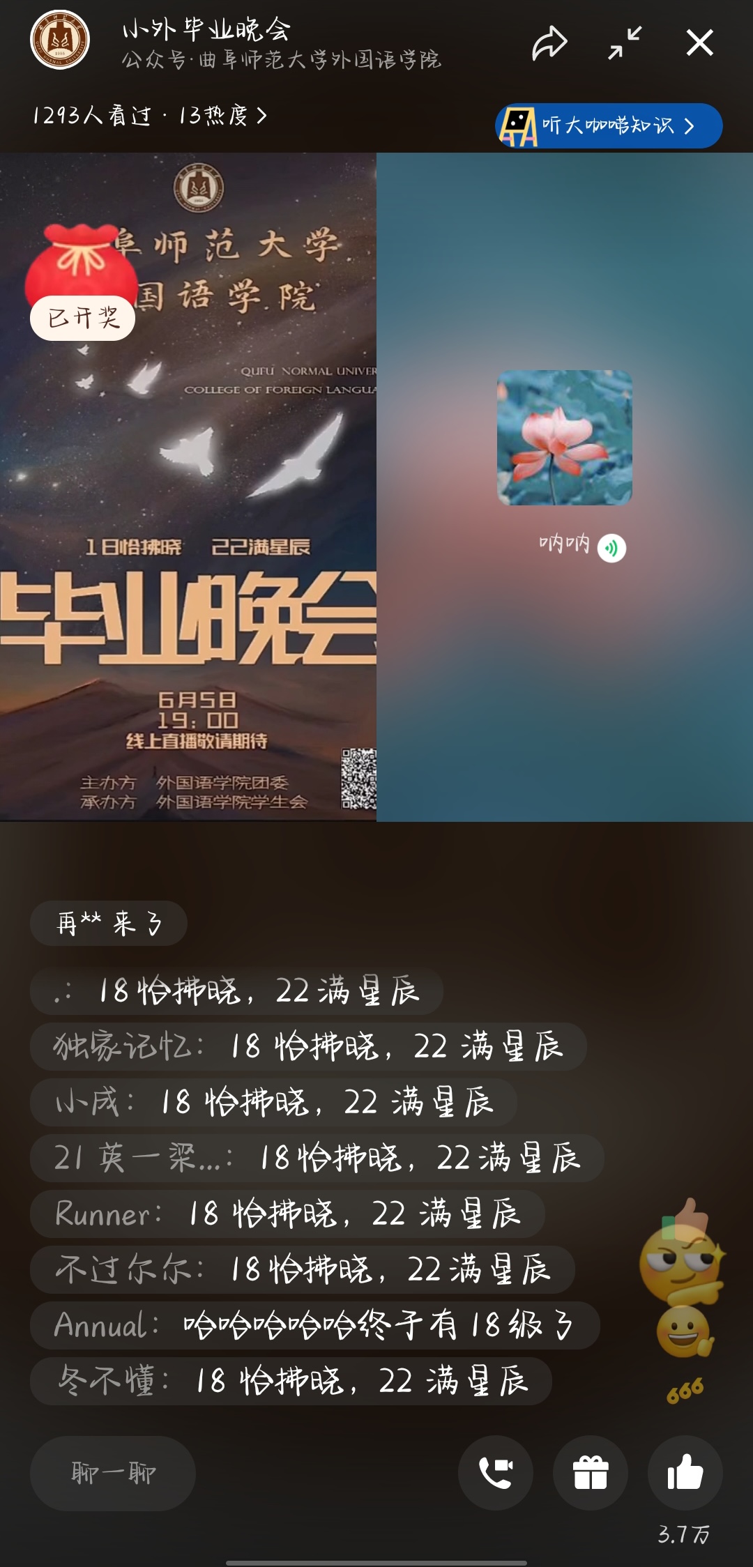 举办2022届“18恰拂晓,22满星河”毕业晚会。本次晚会采用线上直播方式,成人动漫