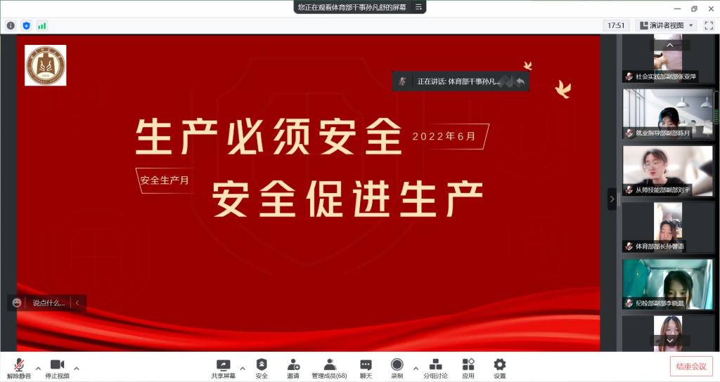 体育部于腾讯会议开展了安全知识技能培训,体育部干事孙凡舒为同学们普及了有关“安全生产月”的知识。6月7日至6月20日,成人动漫