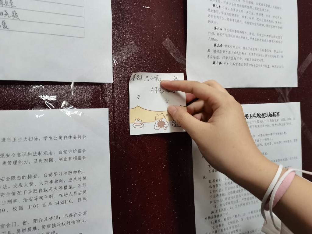 宿管部开展了以暖心便利贴的发放与安全知识讲解为主的“进门入户送安全”活动。宿管部成员们将精心制作的便利贴分发到各宿舍,并细心询问各宿舍是否存在门窗、墙体开裂,楼道走廊护栏松动等安全隐患。