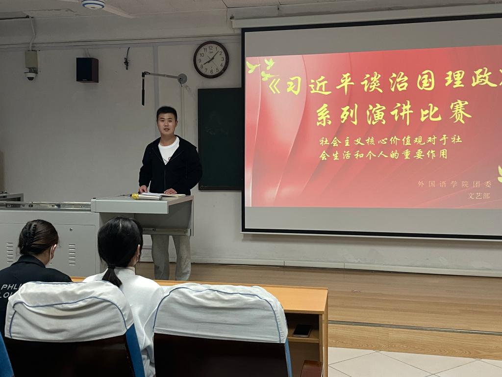 通过初赛的激烈角逐,共有十四位选手脱颖而出。比赛正式开始后,选手们对于社会主义核心价值观的命题发表了自己的见解。其中,沙渺自信昂扬、准备充分,表达了自己对社会主义核心价值观的理解和认识,博得了众人的称赞。沈冰用典型事例,巧妙地展示了社会主义核心价值观对大国、小家以及个人发展所发挥的重要作用,引发众人深思。此外,孙文倩、唐艺宁等同学的精彩演讲令人印象深刻,回味无穷。最后,王仁杰老师对本次比赛进行了总结。他首先指出,正值二十大召开,本次演讲比赛意义非凡,同学们的表现十分精彩。王仁杰老师叮嘱同学们要将理论知识与实践本领相结合,用专业知识传递新时代中的新思想、新力量。同时,王仁杰老师还就演讲比赛对外语专业技能和演讲比赛要领提出了宝贵的意见与指导。通过充分的讨论与研究,本次复赛共选出八位同学进入决赛。