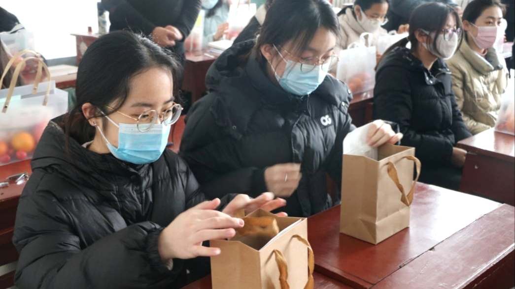 老师们亲切慰问每位同学,并将精心准备的载着学院祝福的“考研爱心礼包”分发给同学们,为他们加油打气。“考研爱心礼包”里装有水果、暖宝宝以及N95口罩。其中的水果寓意颇丰,分别代表着“柿柿”顺心、心想事“橙”和“苹”安顺遂,而暖宝宝和口罩则传递了冬日温暖。一件件贴心的礼物,一声声亲切的问候,让身处紧张备考状态的考研学子深深感受到了成人动漫
