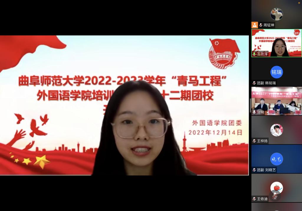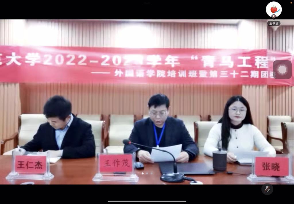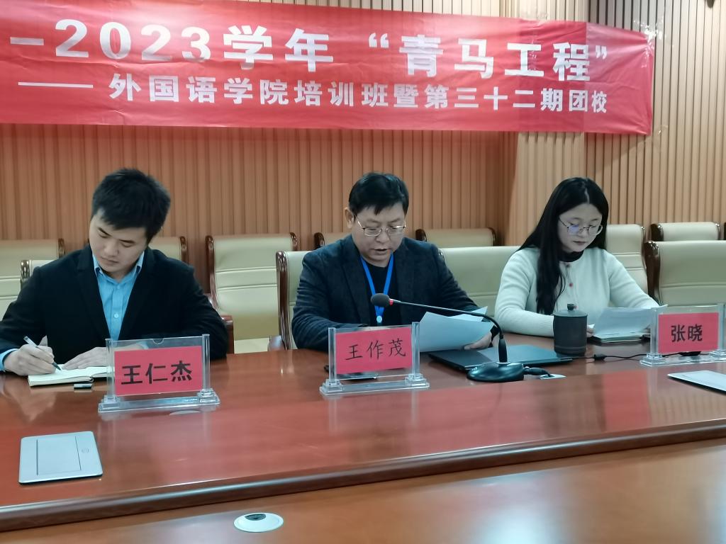 2022—2023学年“青马工程”大学生骨干培训班开班仪式。会议由学院团委副书记张晓主持,学院党委副书记王作茂、辅导员王仁杰及全体“青马工程”学员参加。