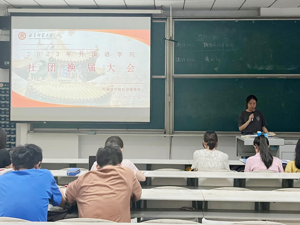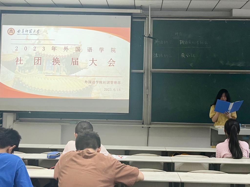 于综合楼206室举办2023年社团换届大会。会议由社团管理部主持,外语协会、法语协会、俄语爱好者协会和爱心社全体成员参加。