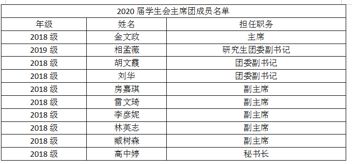 团工作今后的基本思路和努力方向。最后,在充分酝酿和民主选举的基础上对团委副书记进行了届内调整,选举产生了新一届学生会主席团成员。名单如下: