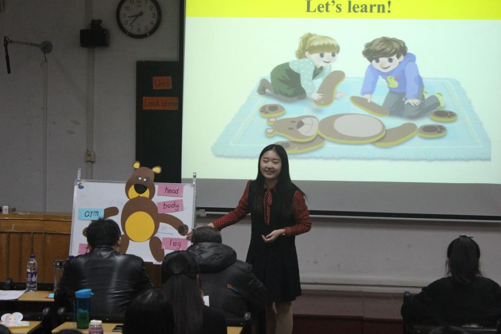 比赛开始,选手们凭借扎实的专业知识和声情并茂的课堂展示,不仅营造了轻松愉悦的课堂氛围,而且创新了素质教育的教学方式,让同学们可以在毫无拘谨的环境中轻松学习。15号选手李硕以“what time do you go to school”作为授课主题,并通过自制的时钟现场教授同学们时间的英语读法。她精彩的师生互动和收放自如的台风,获得评委老师和同学们的一致好评。最终,李硕在评委老师客观公正地评分下获得全场的最高分。