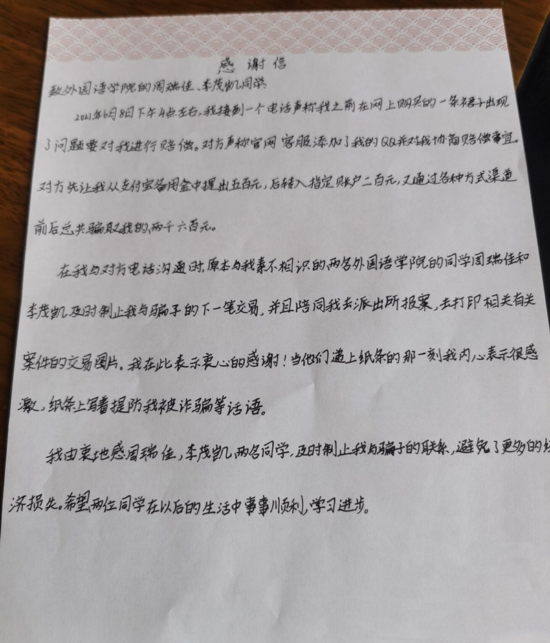 2020级学生周瑞佳、李茂凯在户外运动时偶遇一起电信诈骗事件,并竭尽全力帮助受害同学摆脱诈骗陷阱。该受害同学向周瑞佳、李茂凯同学写来感谢信,以表由衷的感谢。