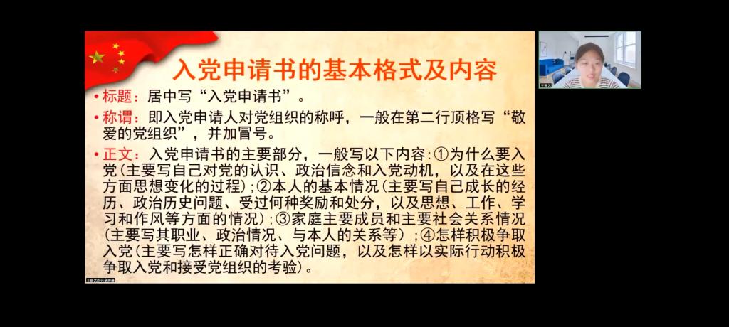 党委的基本情况,带领同学们学习了党的部分基本知识;根据党章要求,她就申请加入中国共产党的条件、入党努力方向以及发展党员的组织程序展开了讲解。最后,她鼓励新生积极行动起来,从身边做起,为人民服务,并预祝同学们早日成为一名中共党员。
