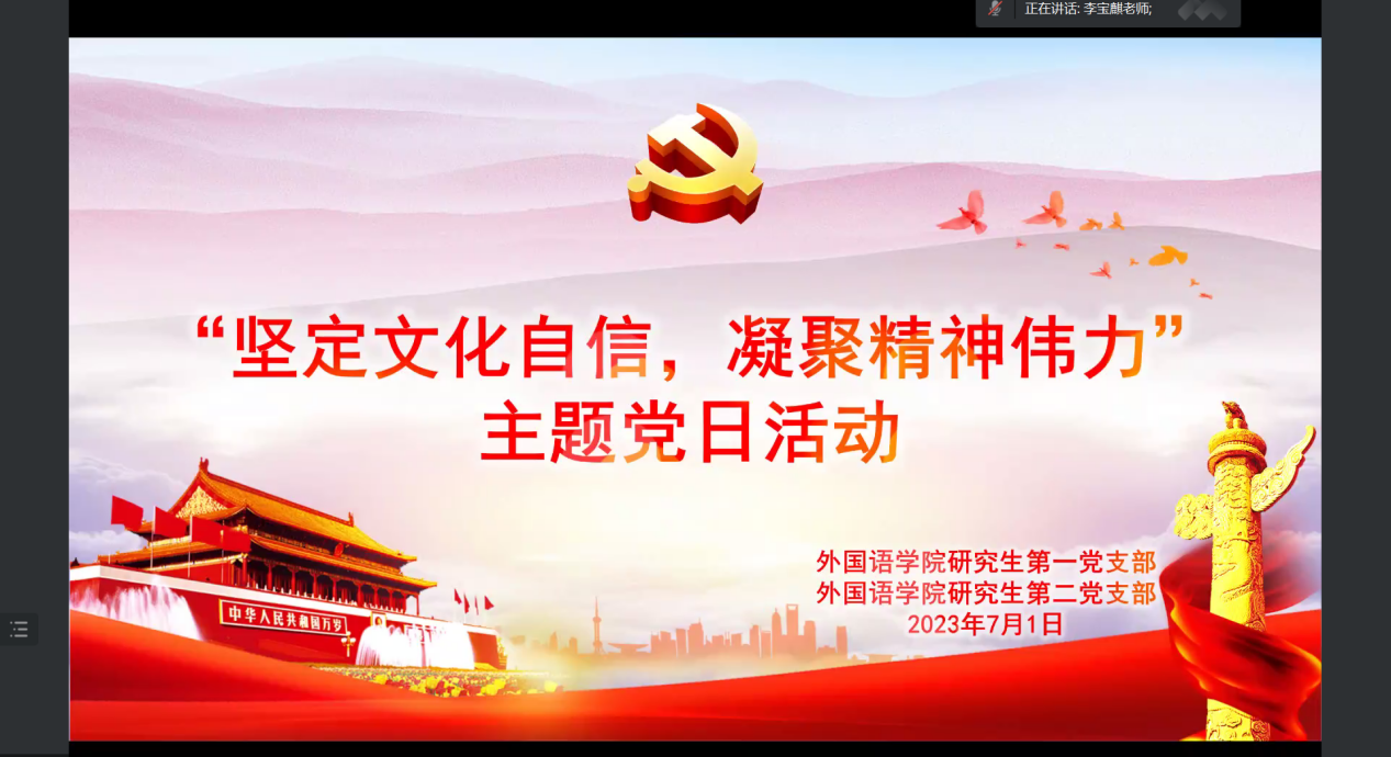 研究生第一党支部与研究生第二党支部通过线上形式,开展了“坚定文化自信 凝聚精神伟力”主题党日活动,本次活动由研究生第一党支部书记李宝麒同志主持,由研究生第二党支部书记王嘉艺同志领学,全体研究生党员参加。